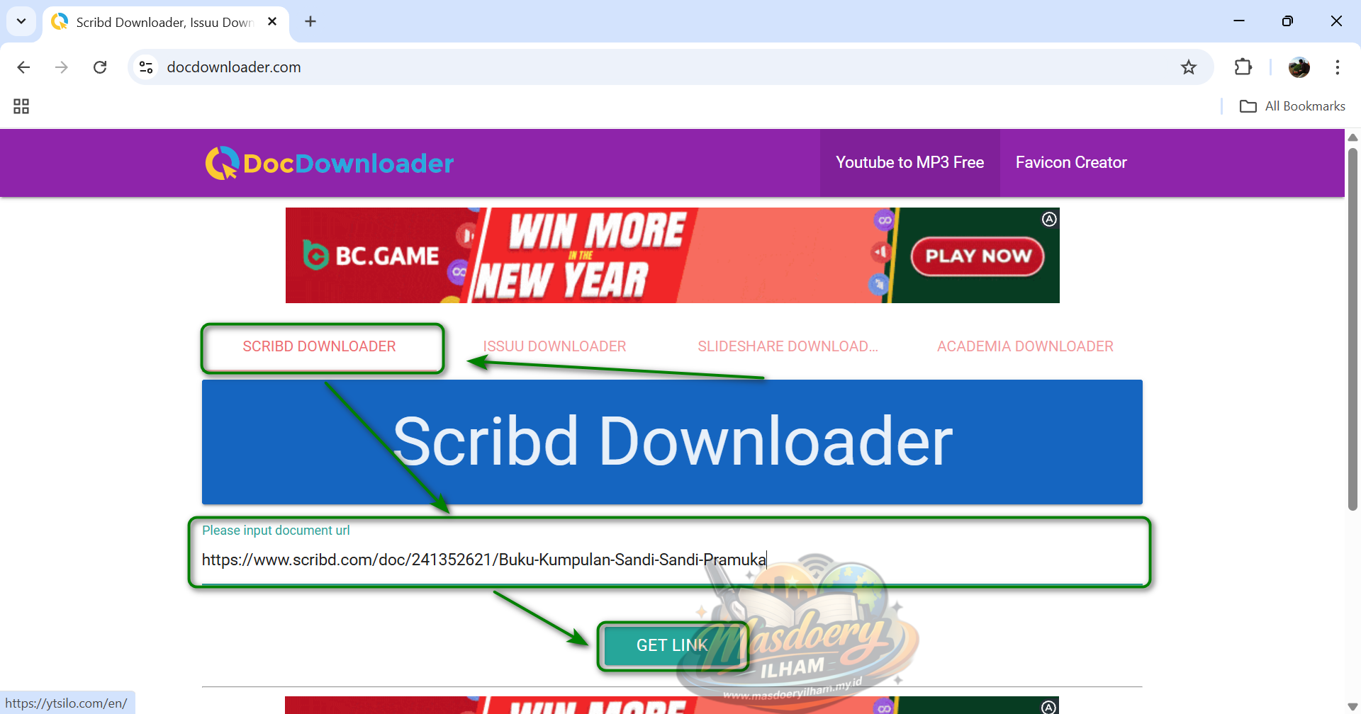 - Pilih SCRIBD DOWNLOADER, kemudian masukkan link file scribd yang sudah di copy sebelumnya pada kolom Please input document url lalu klik tombol GET LINK